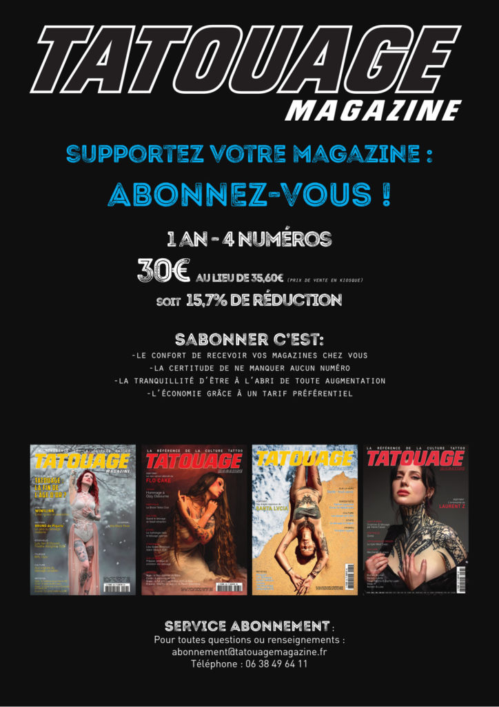 Vous profitez du confort de recevoir votre magazine chez vous. Vous bénéficiez d’un tarif préférentiel garanti – sans augmentation – et surtout vous contribuez à la continuité d’une pierre angulaire de la culture tattoo en France. Merci d’avance !