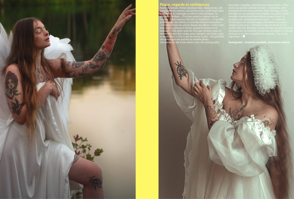 Une aventure née d’une séance avec une photographe lyonnaise, Angelina, devenue une amie proche. « Nous avons une grande alchimie créative. » Ensemble, elles préparent de nouveaux projets. Côté tatouage, Nettys travaille sur son premier dos complet, une pièce monumentale représentant Saint Pierre et ses sévices. Et pourquoi pas quelques guests à venir… À celles qui l’interrogent sur ses tatouages, elle donne un conseil simple et précieux : « Prends le temps de choisir le bon artiste. Sois sûre de ce que tu veux. Et n’aie pas peur de poser des questions, de demander des pauses, de déplacer le stencil. Tant que tu te sens en confiance et respectée, c’est le plus important. »